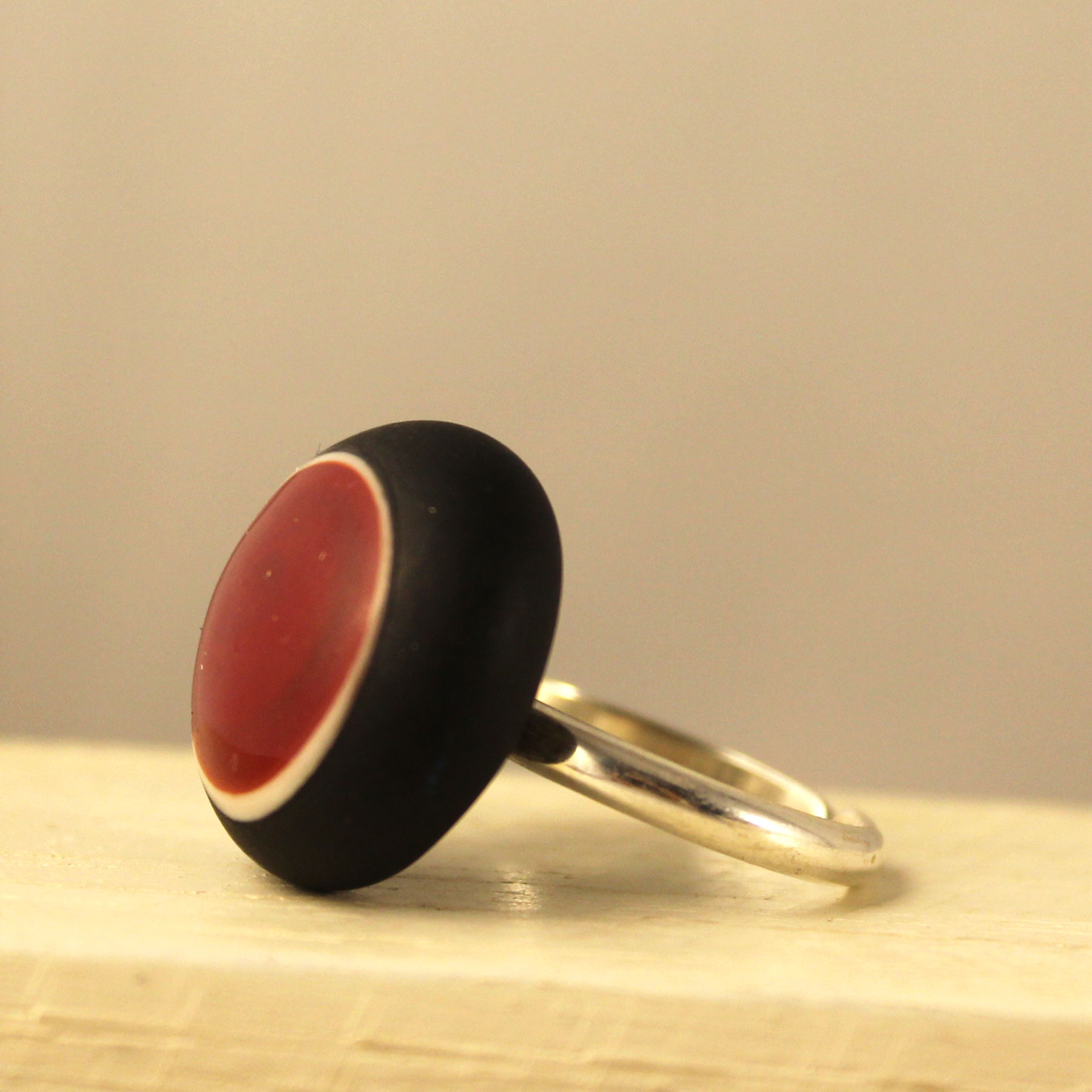 Anillo de vidrio de Murano y plata. La pieza de vidrio (de 1,7 cm de diámetro aprox.) tiene una base negra con acabado en mate, sobre ella un cerco crema y, en el centro, una esfera roja con acabado en brillo. La pieza está realizada sobre un hilo de plata de 1,2 mm de grosor, abierto para poder ajustarse.
