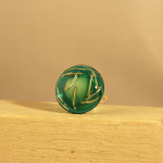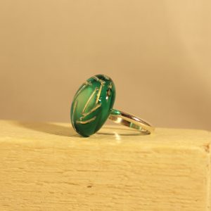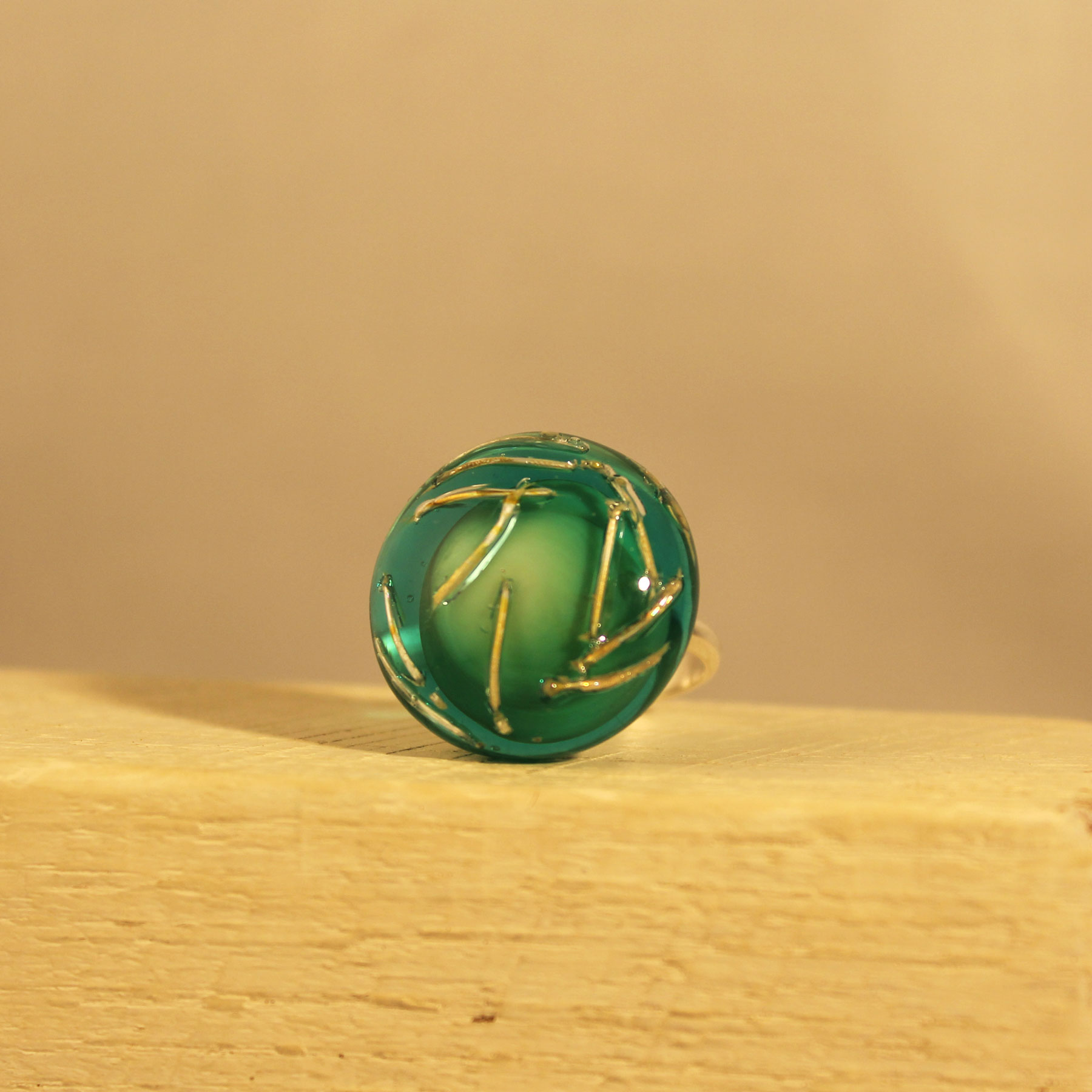 Anillo de vidrio de Murano y plata. La pieza de vidrio, de 2 cm aprox., tiene una base color crema y, sobre ella, vidrio de color verde transparente. En el interior se funden hilos de plata. La pieza está realizada sobre un hilo de media caña de 2,5 mm abierta para ajustarse.
