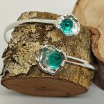 Brazalete de plata con incrustaciones de vidrio verde azulado, que brilla con la luz del sol como si fuera el reflejo del océano mismo. Cada detalle de esta pieza única evoca la serenidad y la belleza del mar, llevando consigo el encanto de las profundidades y la frescura de la brisa marina. Quienes lo llevan puesto parecen portar un pedacito del océano consigo, una conexión especial con la naturaleza que los rodea. Este brazalete, producto del talento y la dedicación de un hábil artesano, es mucho más que una simple joya; es un símbolo de admiración y respeto hacia el vasto y misterioso mundo submarino.