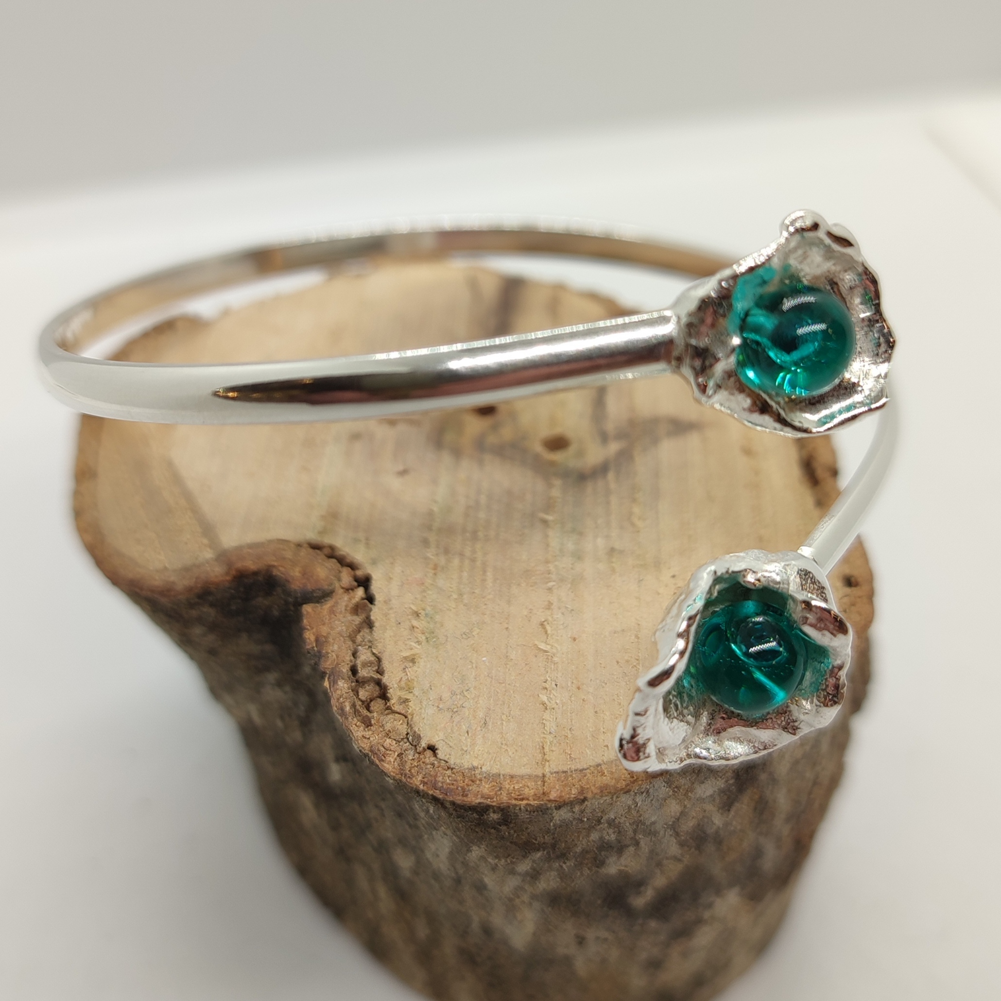 Brazalete de plata con incrustaciones de vidrio verde azulado, que brilla con la luz del sol como si fuera el reflejo del océano mismo. Cada detalle de esta pieza única evoca la serenidad y la belleza del mar, llevando consigo el encanto de las profundidades y la frescura de la brisa marina. Quienes lo llevan puesto parecen portar un pedacito del océano consigo, una conexión especial con la naturaleza que los rodea. Este brazalete, producto del talento y la dedicación de un hábil artesano, es mucho más que una simple joya; es un símbolo de admiración y respeto hacia el vasto y misterioso mundo submarino.