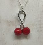 El colgante presenta dos esferas de vidrio rojo, que simbolizan las cerezas, engarzadas con delicadeza sobre la plata.
