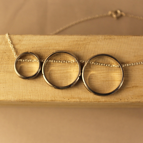 Los tres aros están unidos por una cadena de plata de 32 cm de longitud, que presenta un cierre de reasa que garantiza un ajuste seguro.