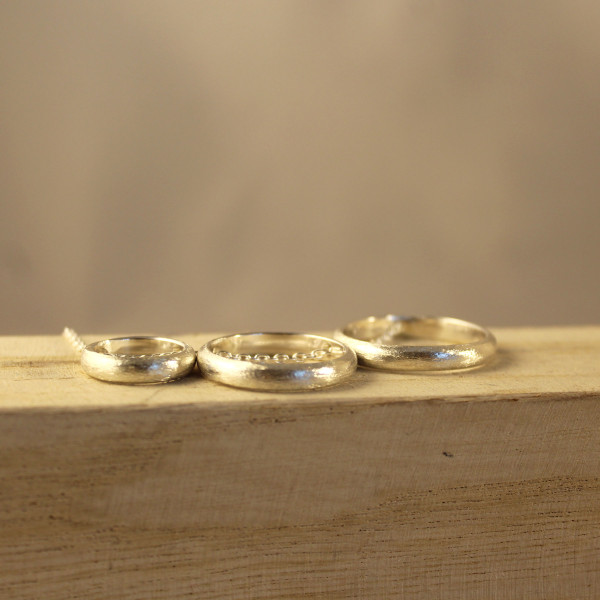 A través de sus tres aros de plata de media caña, cada uno con una textura única y un acabado mate que le proporciona un aspecto sofisticado y discreto.