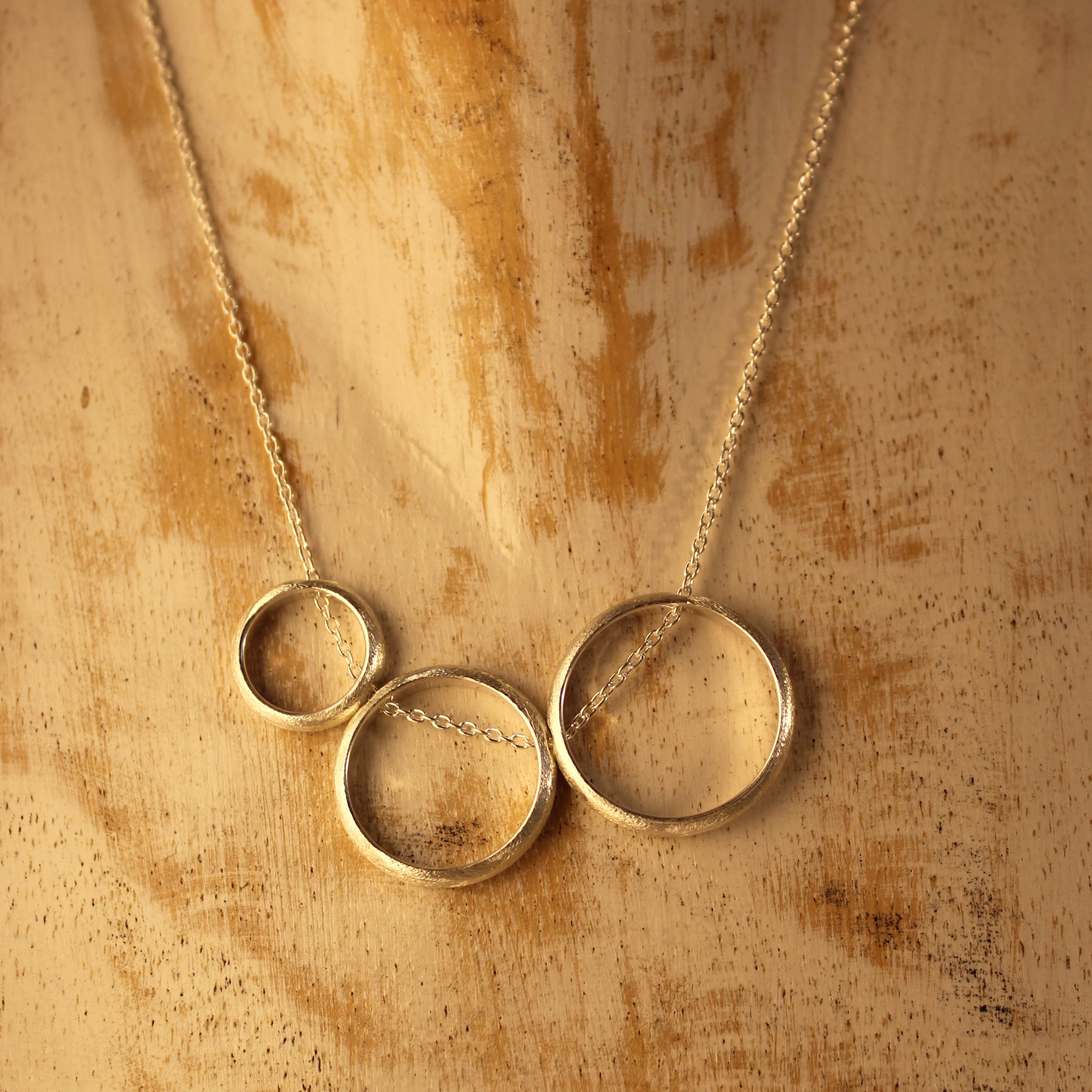 Este colgante presenta tres aros de plata de diferentes diámetros: 2,3 cm, 2 cm y 1,5 cm. Cada aro tiene una textura distintiva que agrega profundidad y dimensión a la pieza.