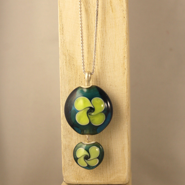 En el centro de cada pieza, tanto en el frente como en la parte posterior, se encuentra un delicado dibujo de una flor en tono verde claro. Esta característica doble cara agrega un nivel adicional de detalle y sofisticación al collar.
