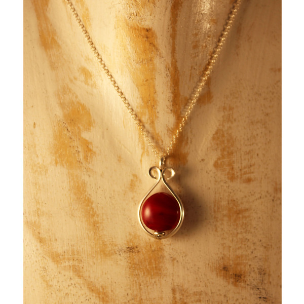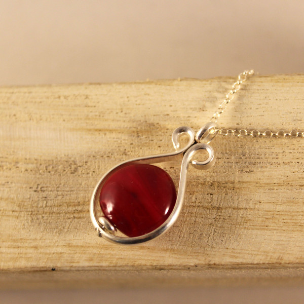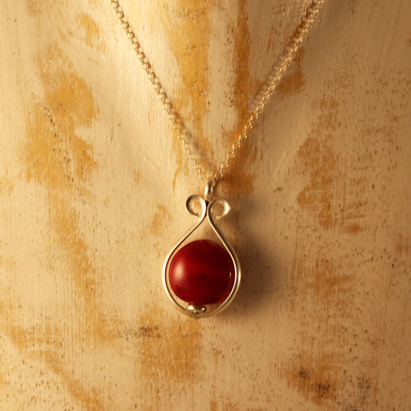 El colgante presenta una esfera plana de vidrio de Murano en un cautivador tono rojo.