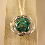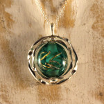 Los aros de plata móviles le dan movimiento y dinamismo al colgante, mientras que el color verde del vidrio de Murano agrega un toque de frescura y naturaleza.
