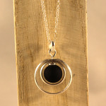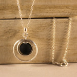 Este colgante presenta dos aros de plata de media caña que se mueven, creando un efecto dinámico y atractivo. En el centro de estos aros, se encuentra una esfera de vidrio de Murano en un tono negro mate.