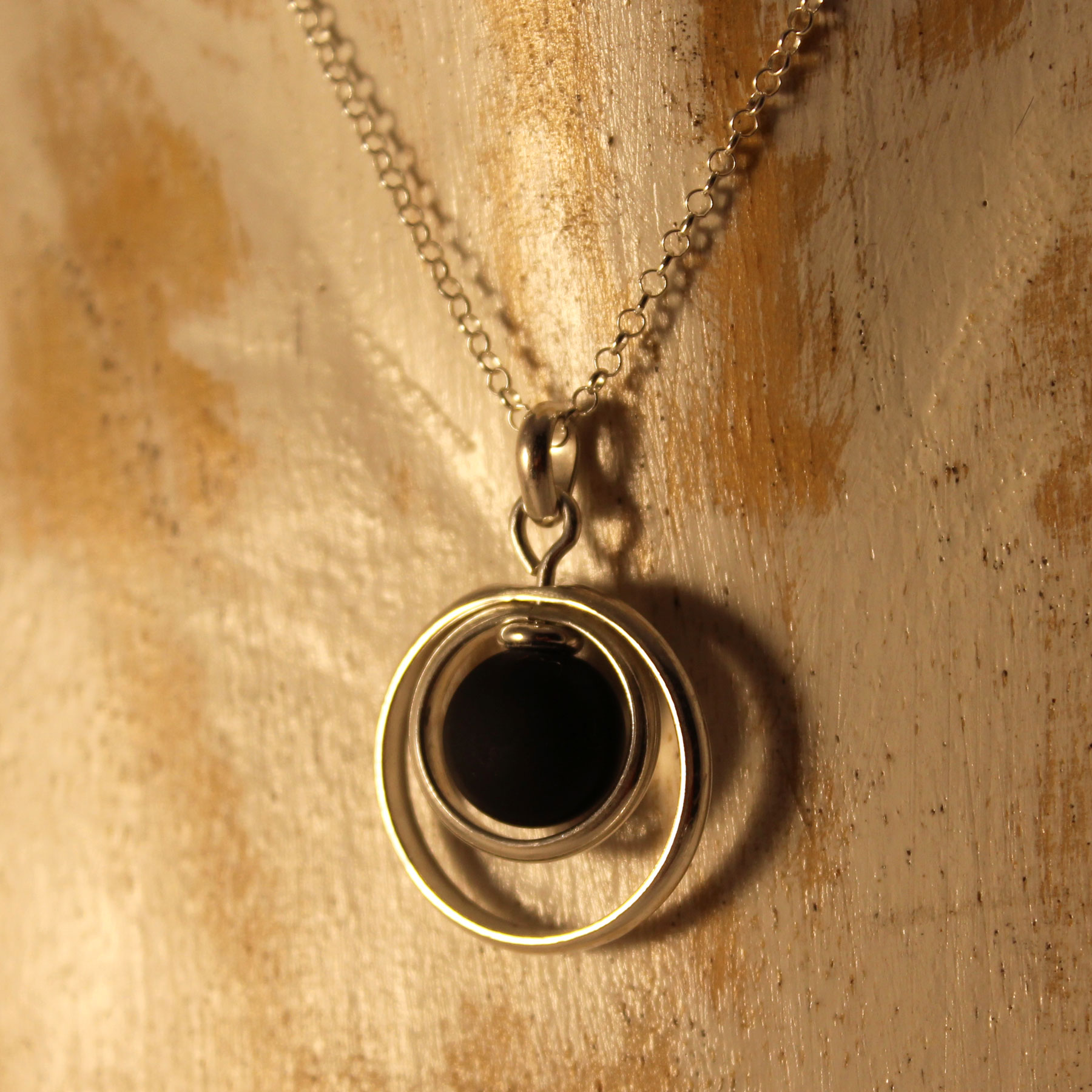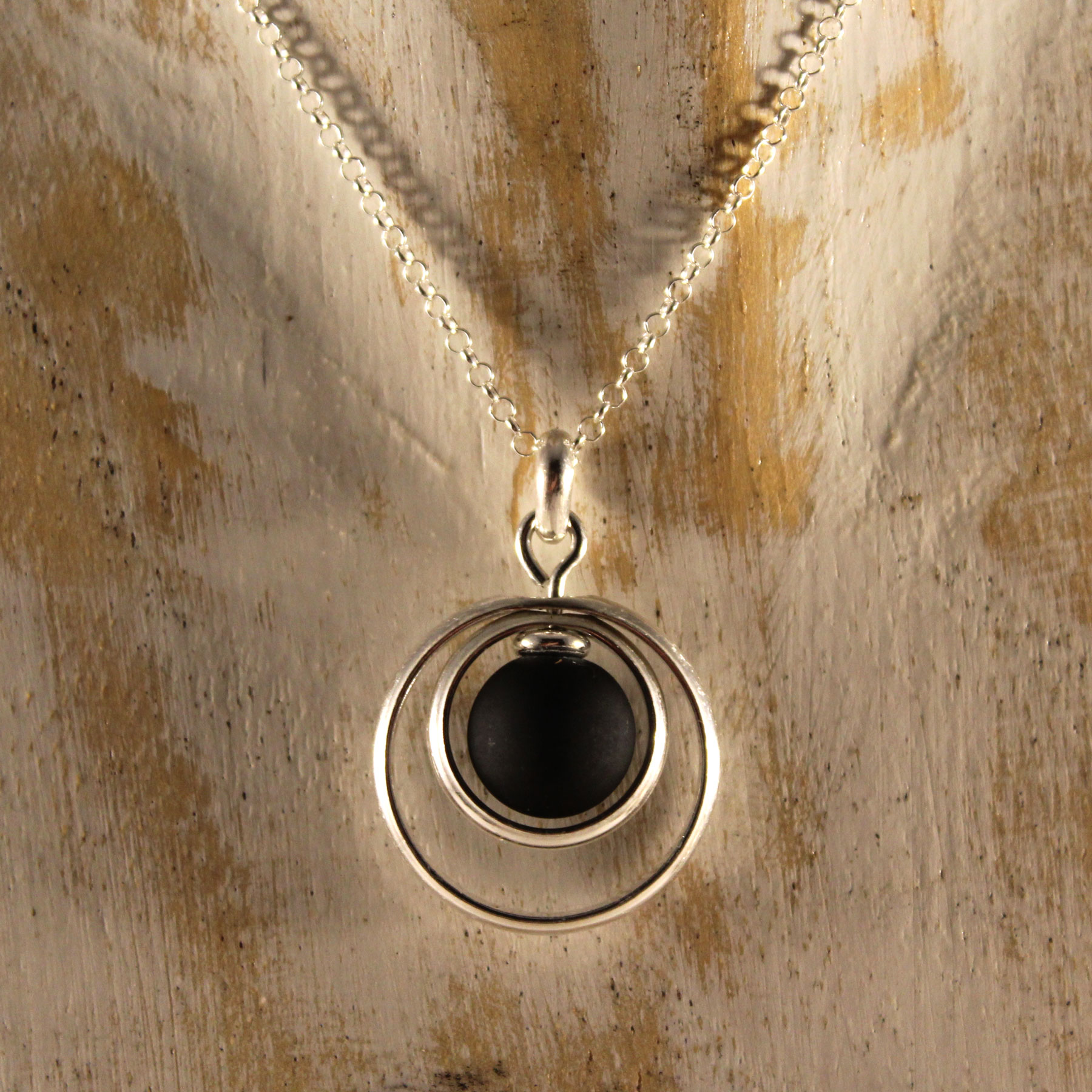 Este colgante presenta dos aros de plata de media caña que se mueven, creando un efecto dinámico y atractivo. En el centro de estos aros, se encuentra una esfera de vidrio de Murano en un tono negro mate.