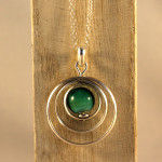 Este colgante único presenta una estructura singular compuesta por tres aros de plata móviles, dispuestos en una secuencia decreciente.