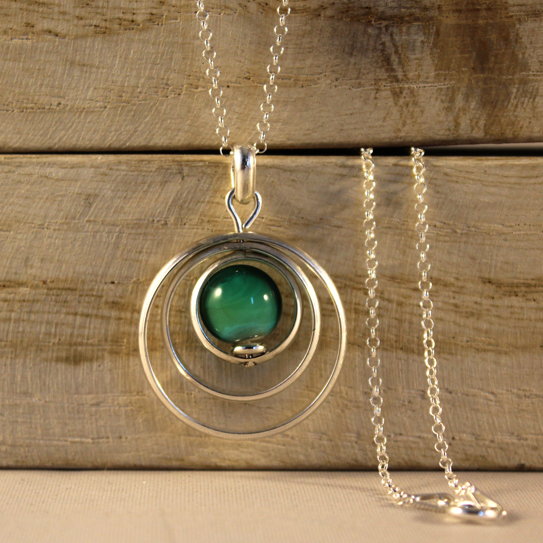 Este colgante único presenta una estructura singular compuesta por tres aros de plata móviles, dispuestos en una secuencia decreciente.