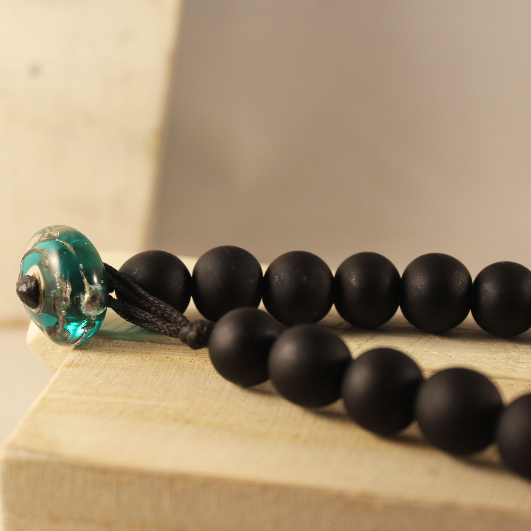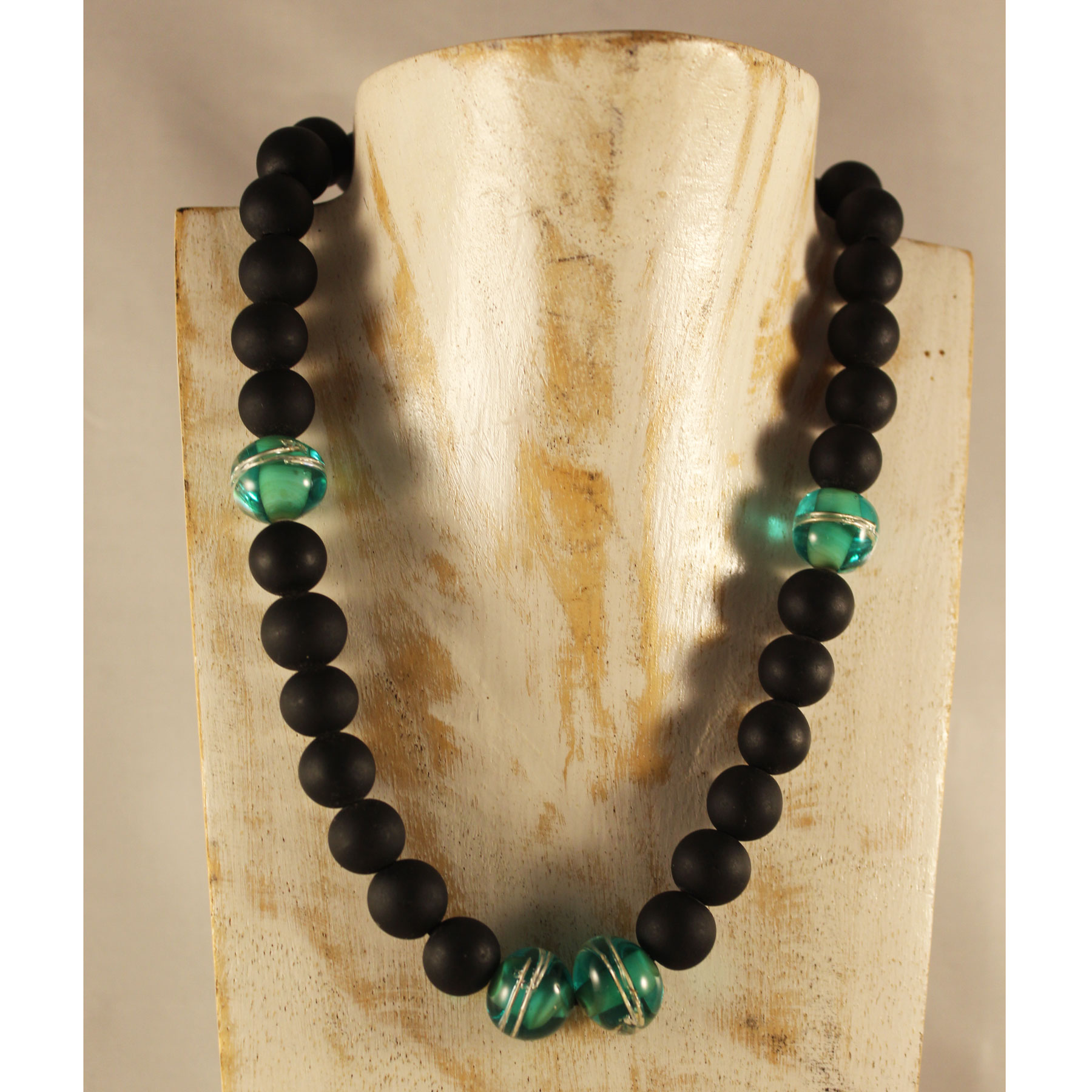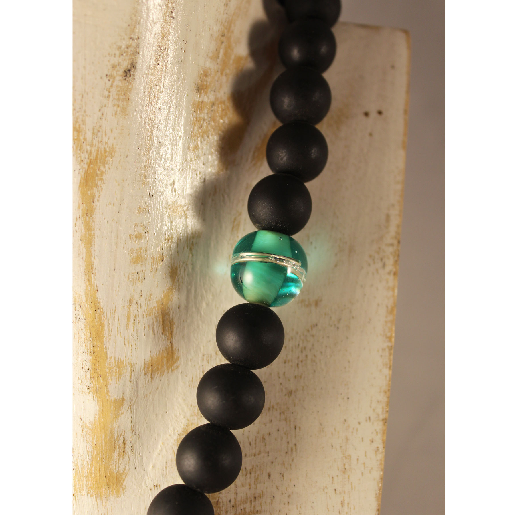 El Collar Vulcano Guara presenta un diseño cautivador. Compuesto por 36 esferas de vidrio de Murano, 32 de ellas en tono negro con acabado mate y un diámetro de aproximadamente 1 cm, intercaladas con 4 esferas en tono crema con un acabado verde transparente en su interior, estas últimas tienen un diámetro de aproximadamente 1,5 cm. Las esferas están engarzadas en hilo encerado de gran resistencia, asegurando durabilidad y soporte.