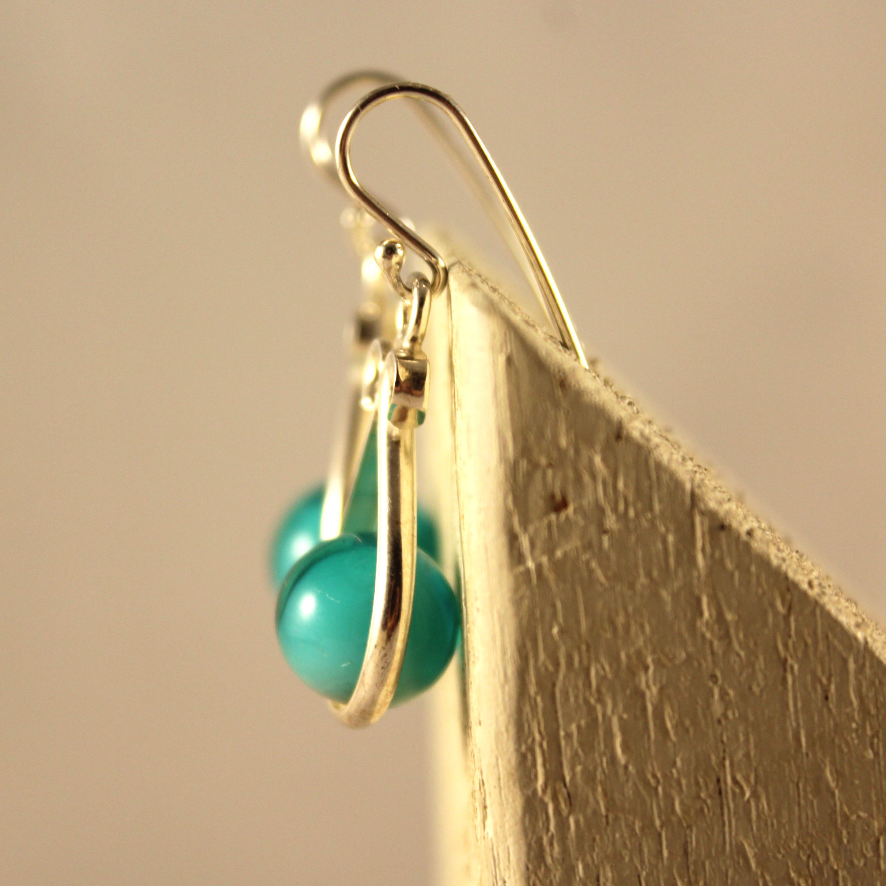 Estos pendientes presentan dos esferas de vidrio de Murano en un tono turquesa vibrante, engarzadas en hilo de plata de media caña de 2 mm.