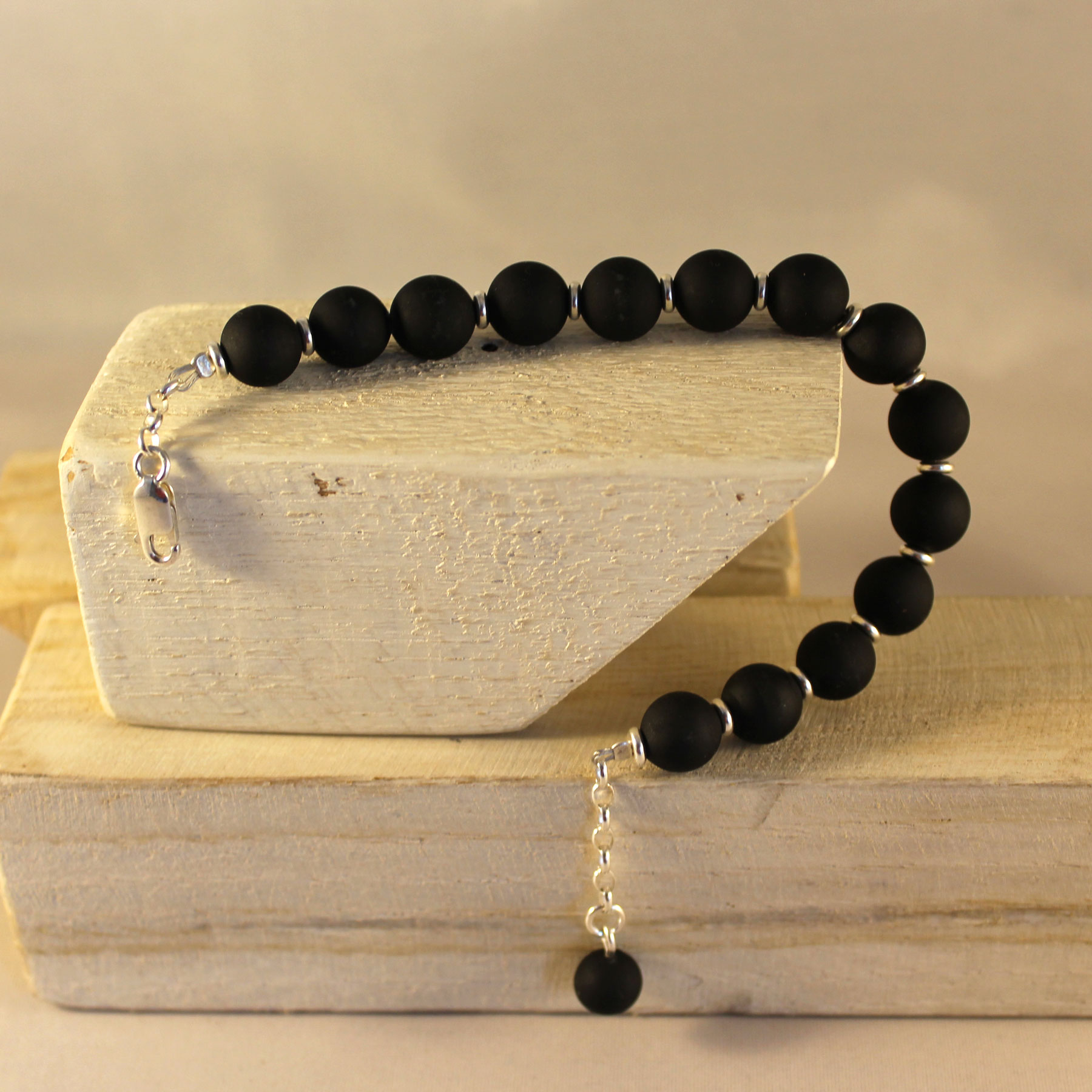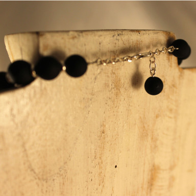 Con 14 esferas negras en acabado mate, con un diámetro de aproximadamente 1 cm, esta pulsera crea un efecto visualmente cautivador. Cada esfera está separada por una pequeña pieza de plata, que agrega un toque de brillo sutil.