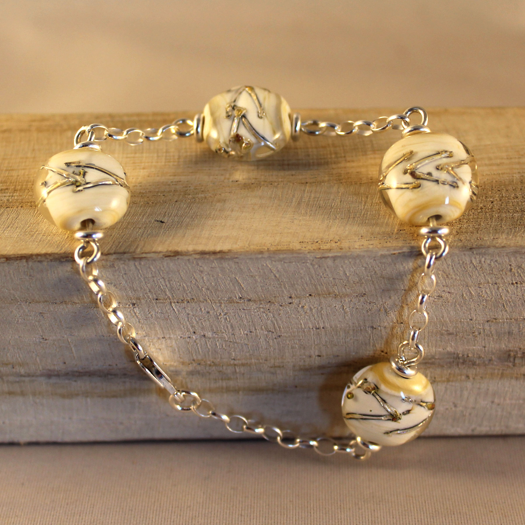 Consta de cuatro piezas ovaladas de vidrio de Murano, cada una con un diámetro de aproximadamente 1,5 cm. En el interior de estas piezas de vidrio crema, se entrelazan delicados hilos de plata fundidos, añadiendo brillo y sofisticación a la pulsera.